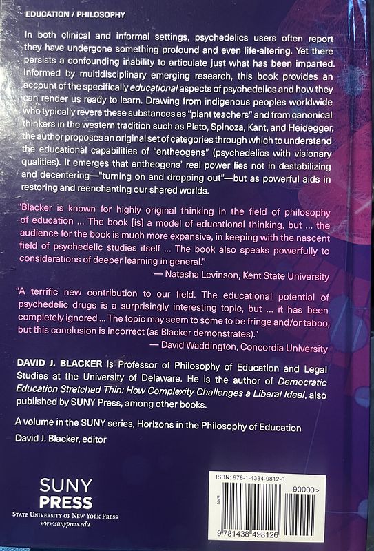 Informed by multidisciplinary emerging research, this book provides an account of the specifically educational aspects of psychedelics and how like the best teachers they can render us ready to learn. Drawing from indigenous peoples worldwide, who typically revere these substances as “plant teachers,” and also from canonical thinkers in the western tradition such as Plato, Descartes, Hume and Heidegger, Blacker proposes an original set of categories through which to understand the educational capabilities of classic psychedelics. While there is no neat blueprint, it turns out that beneath the kaleidoscope of distorted perceptions, there are discernible patterns that point in very surprising directions. It emerges that psychedelics’ real power lies not in destabilizing and decentering—“turning on and dropping out”—but as powerful aids in restoring and reenchanting our shared worlds.